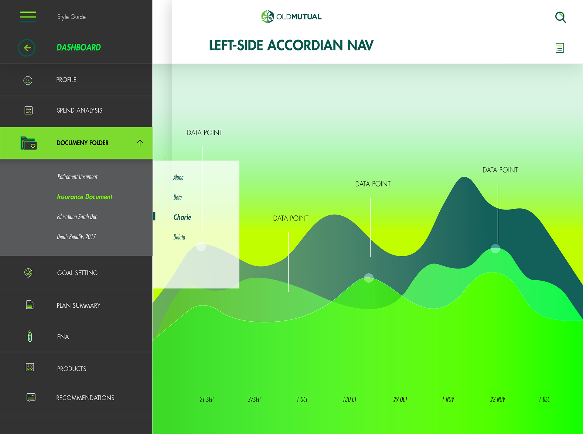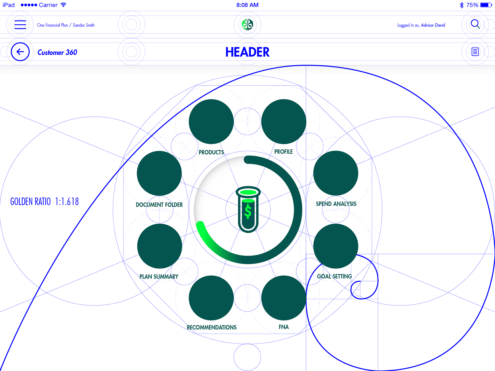 The Customer 360 dashboard was conceived as a single, intelligent view of a client’s financial world. Inspired by the golden ratio (1:1.618), I developed a circular, fractal-based layout that gave form to Old Mutual’s philosophy of balance, growth, and connection. This geometric framework became both visual language and navigational logic — a system where data expanded and contracted naturally, mirroring the rhythms of financial decision-making.