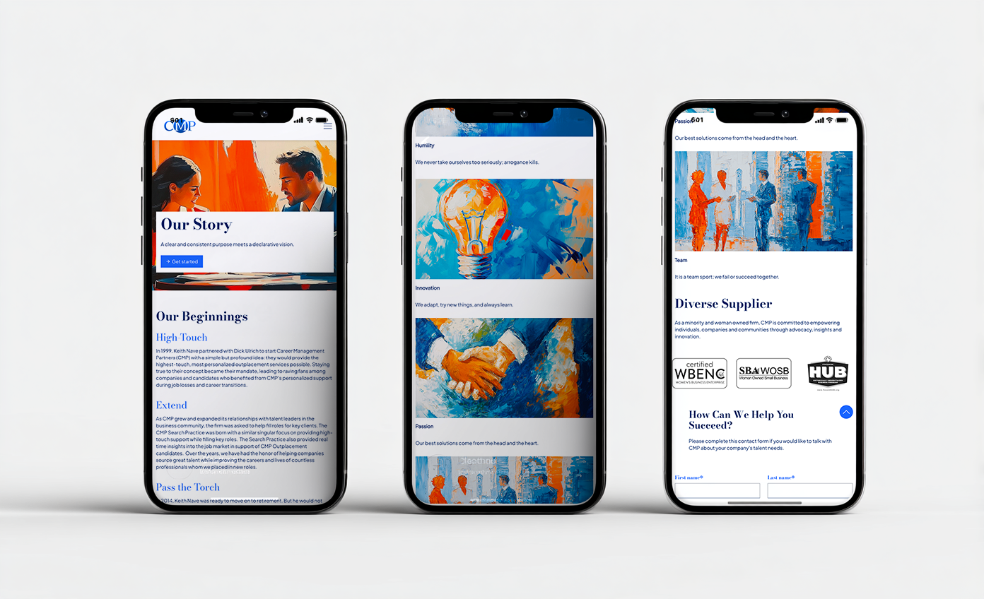 CMP (Career Management Partners) is a leadership and career transition firm focused on people, progress, and potential — values that demanded a visual language as human as their mission.