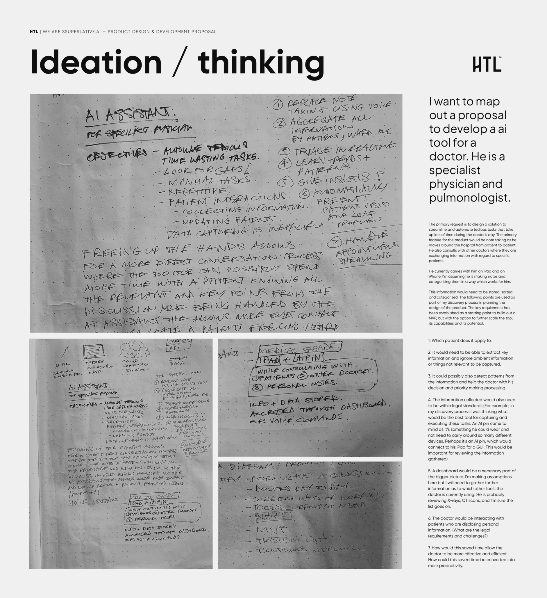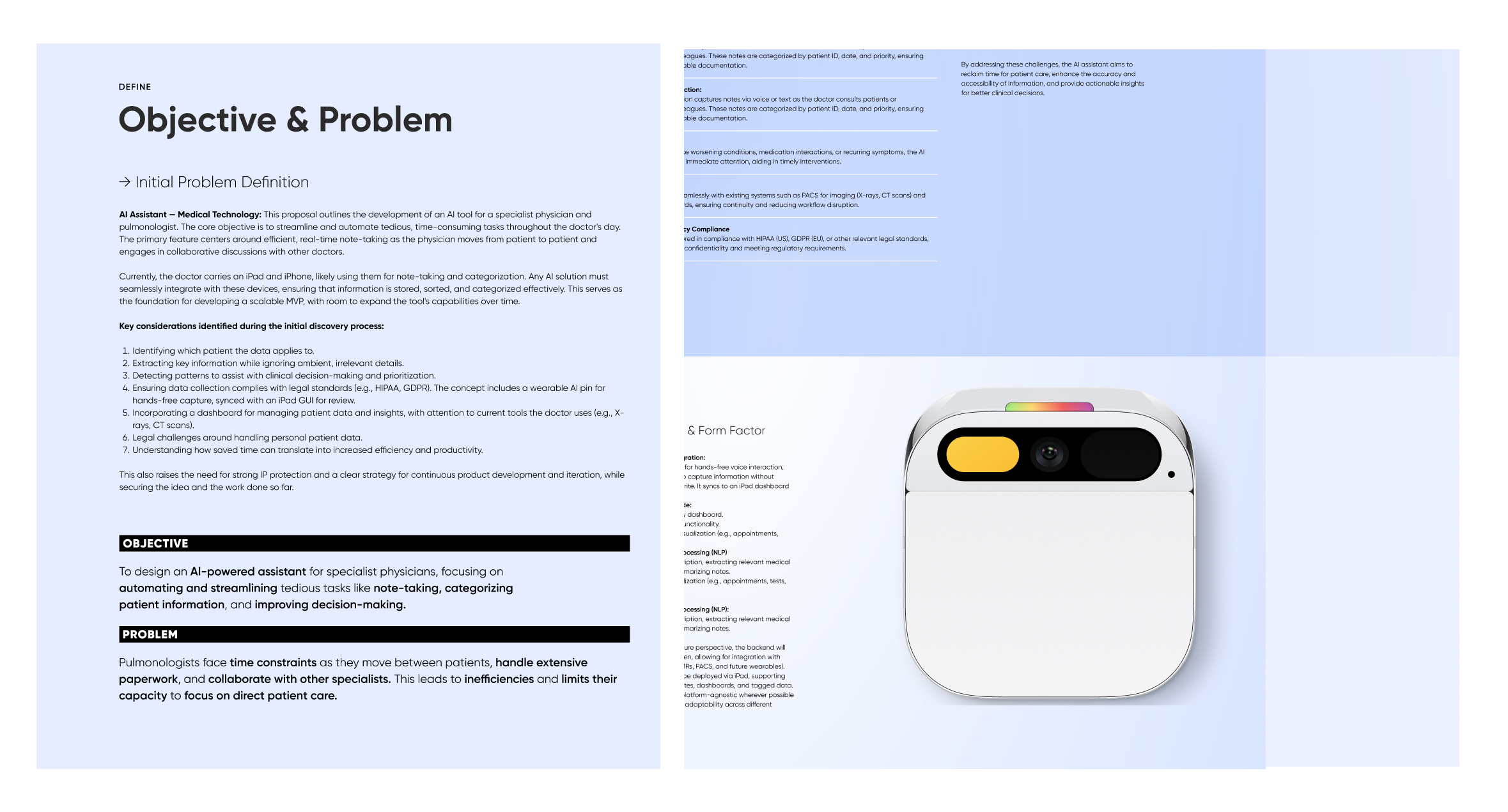 The project began with observation. I shadowed a pulmonologist moving between patients, iPad in hand, splitting attention between voice, notes, and thought. Every minute spent documenting was a minute taken from care. The challenge was clear: how do you automate the administrative without losing the human?