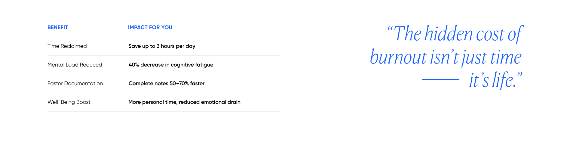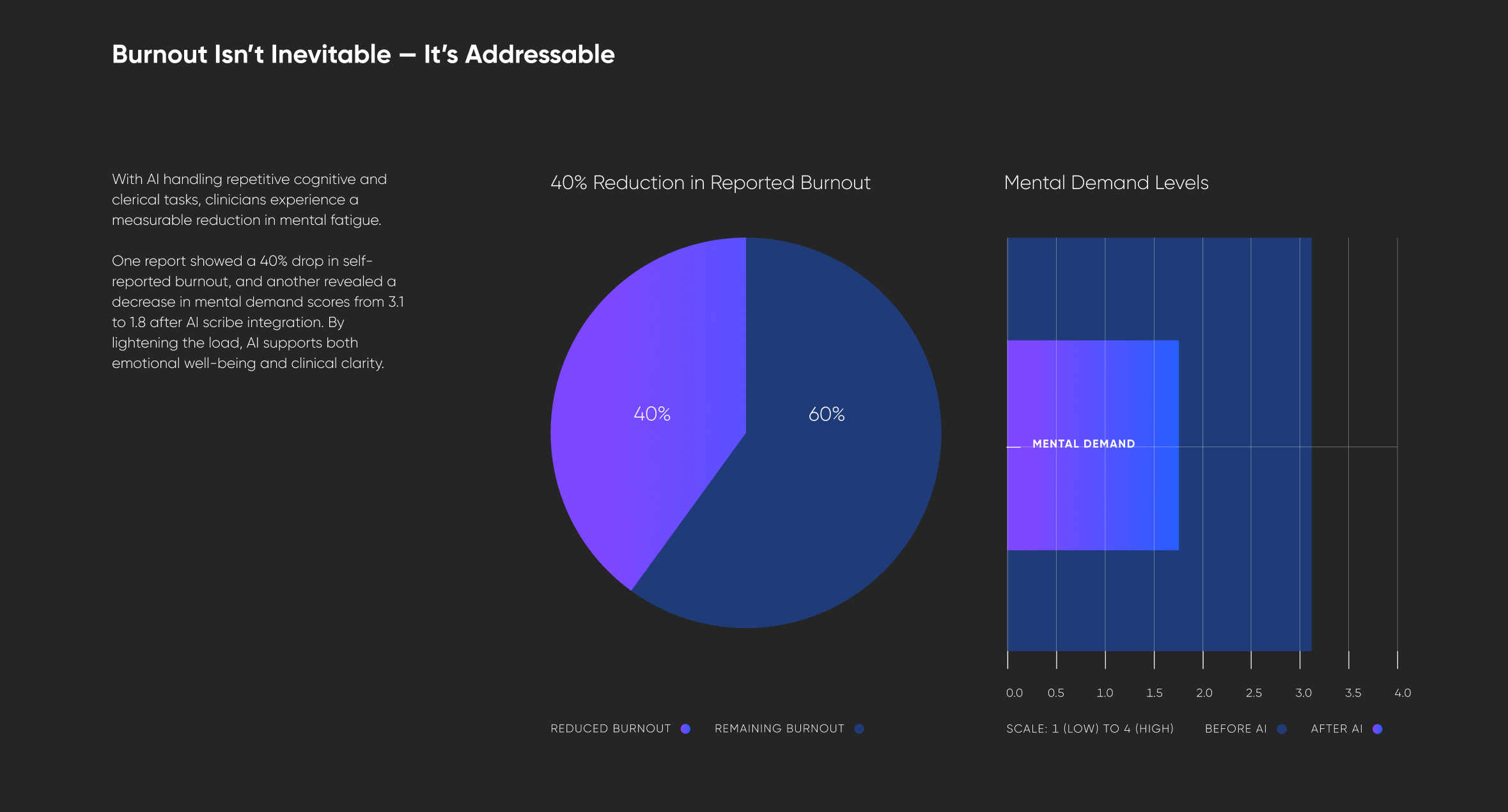 The goal isn’t to replace doctors — it’s to restore their time. Early discovery revealed that AI note-taking could reclaim up to three hours a day, reduce mental load by 40%, and improve documentation accuracy by 50–70%. Each reclaimed hour becomes care returned: deeper patient conversations, sharper decisions, and more humane medicine.