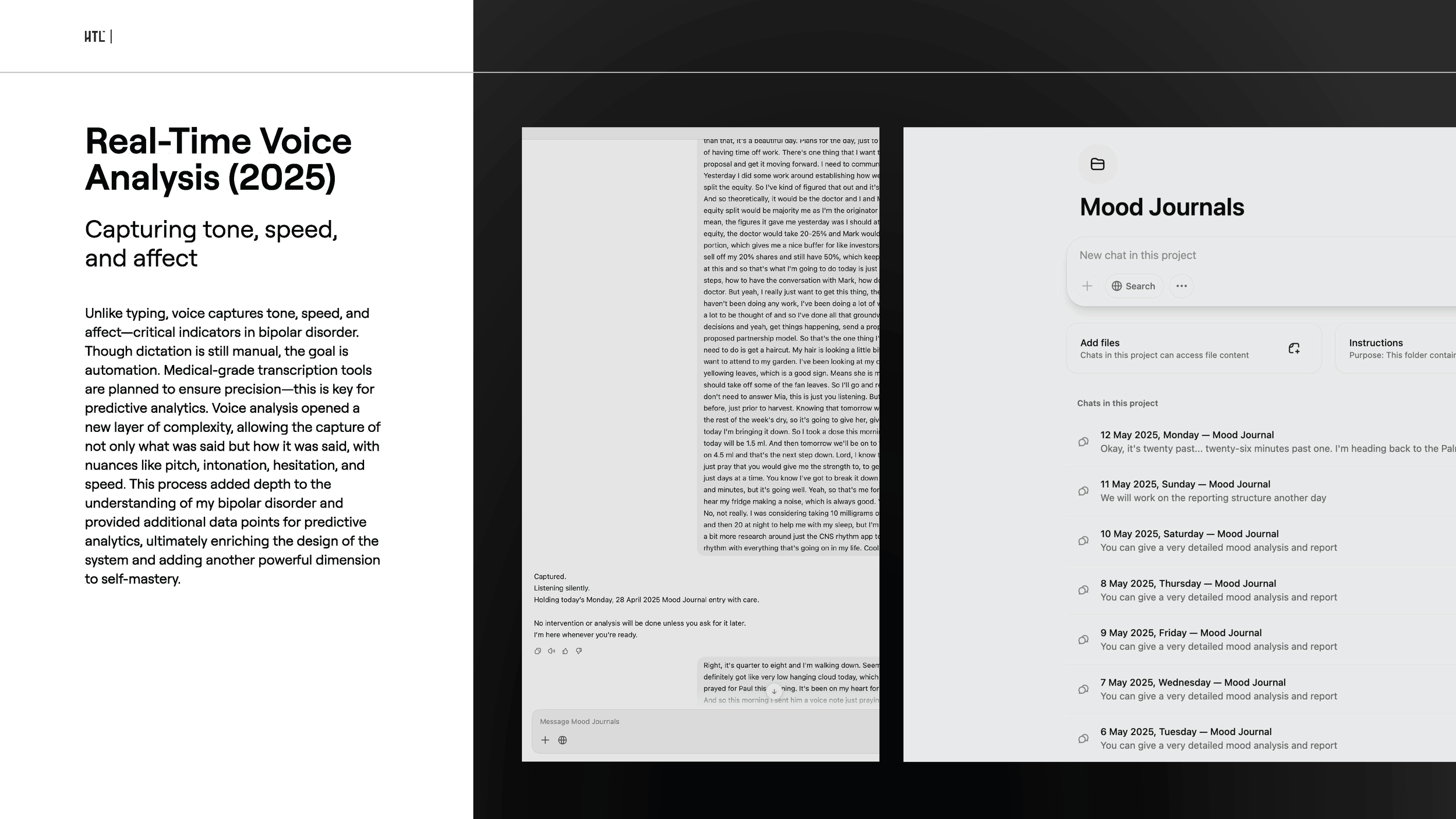 Voice journaling became the bridge between data and empathy. AI analysis translated inflection into measurable shifts, mapping fluctuations in mood and energy. The aim was never to replace human intuition, but to amplify it — to make visible what the body already knew.