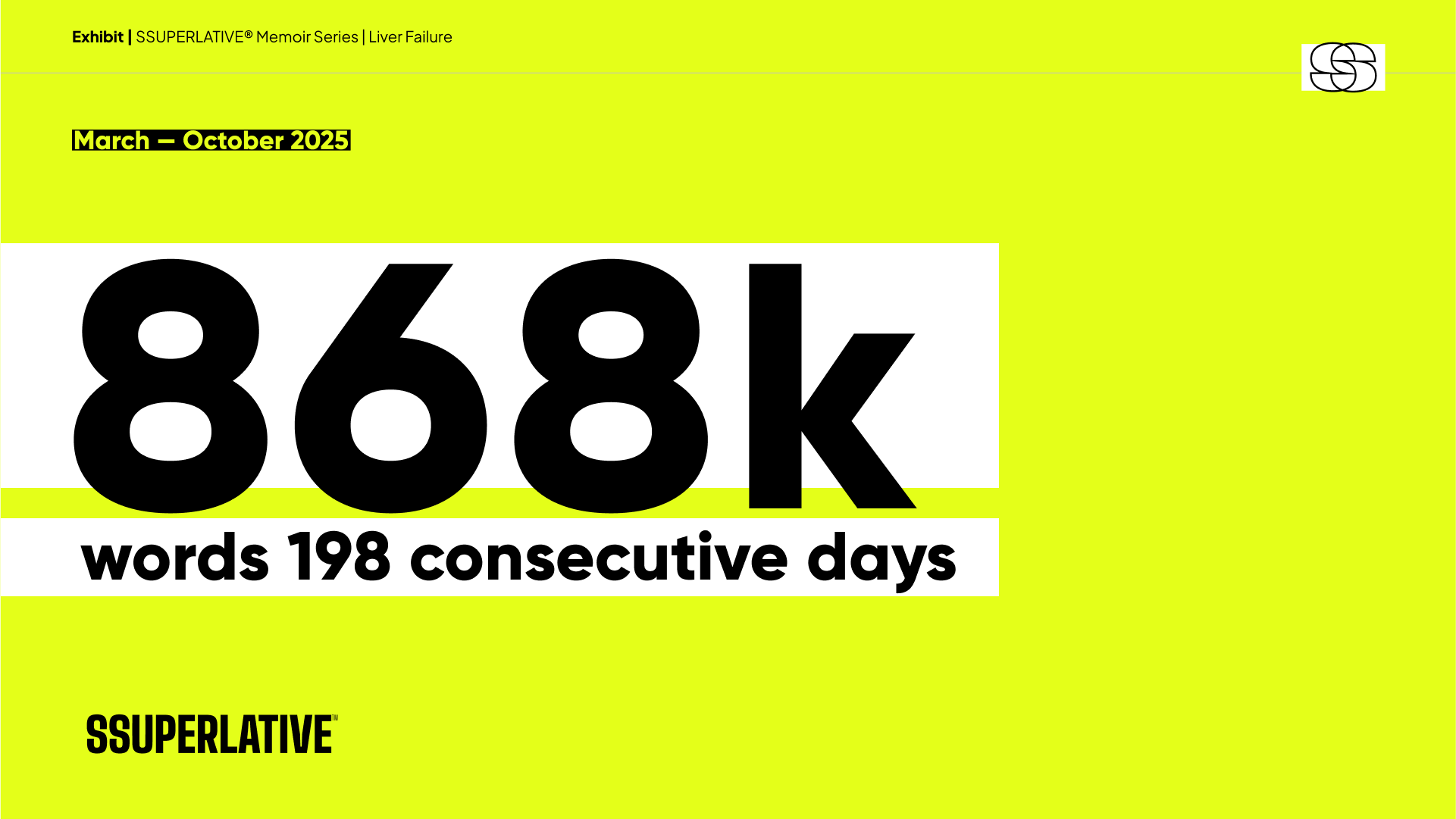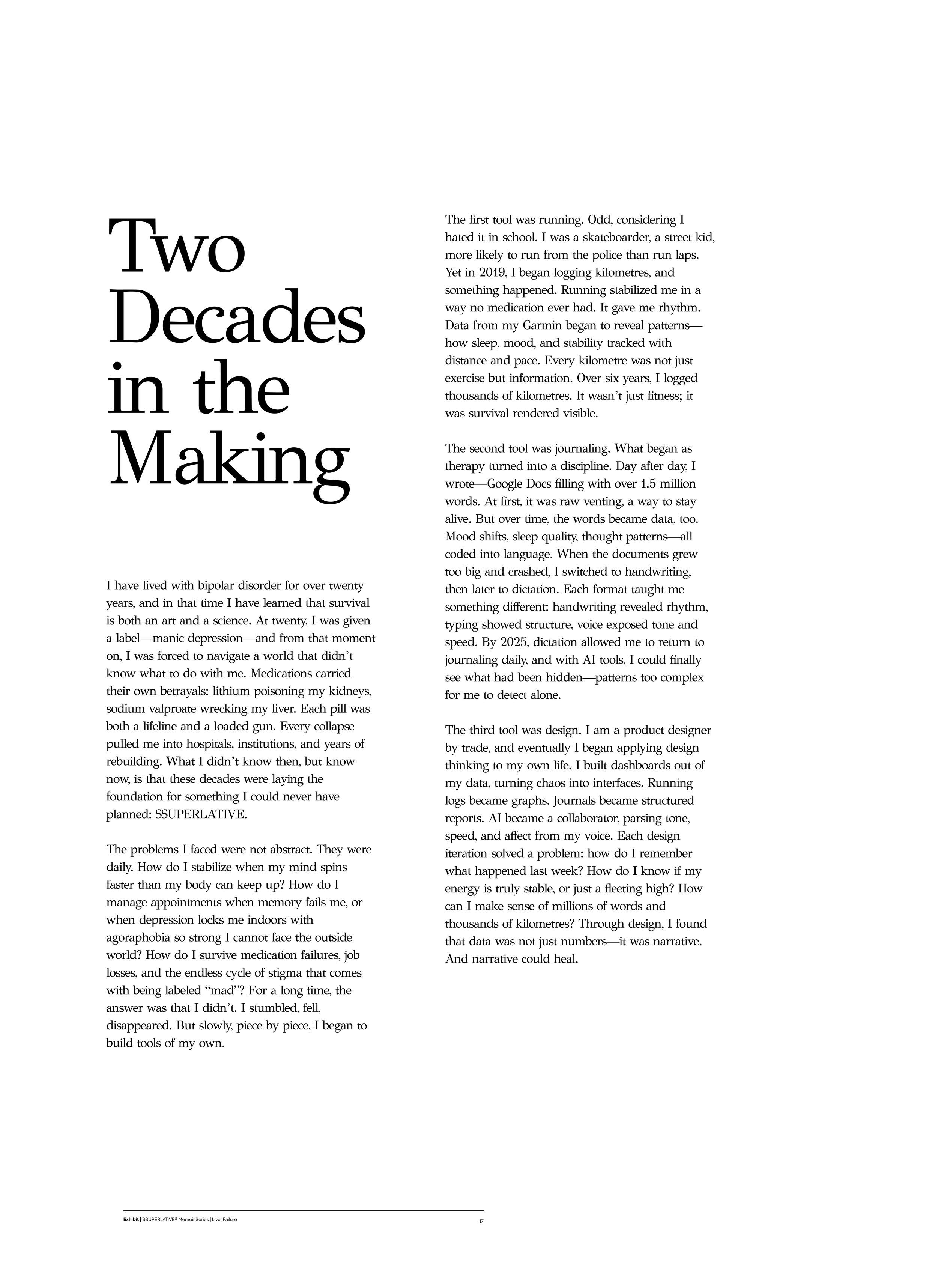 It was a complicated year [2025] — one that demanded growth, resilience, and deeper creative focus. My work on SSUPERLATIVE™ turned a corner through the use of AI-driven daily mood journaling, continuing the long story of living with bipolar disorder. Over 868,000 words later, the project had evolved into both archive and experiment, reflecting the ongoing dialogue between design, data, and self-understanding.