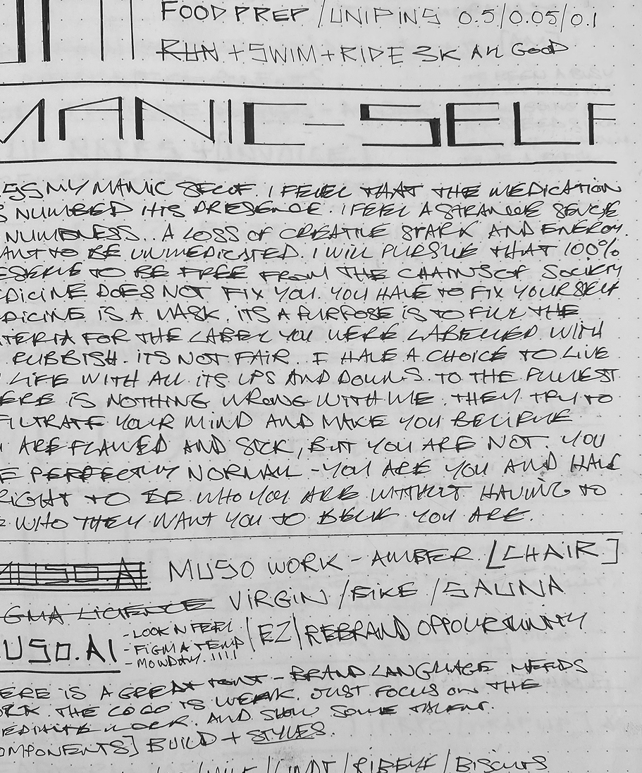 Balancing life as an athlete, a person living with bipolar disorder, and a functioning creative product designer has meant navigating multiple dimensions of identity — physical endurance, emotional volatility, and intellectual precision. Being a designer has shaped the way I approach this system: through the lens of traditional product design, yet applied to the far more complex problem of human experience.