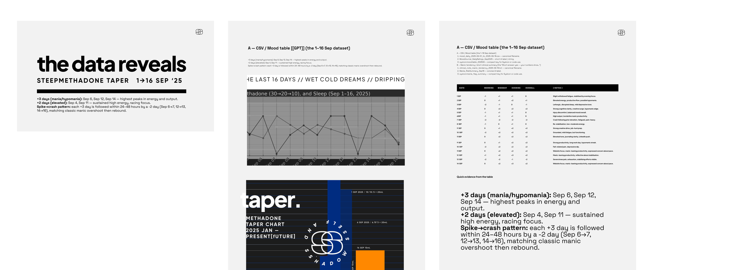 Compulsion became another form of data. Late nights rebuilding decks, chasing visual logic through fatigue — mania disguised as precision. Within SSUPERLATIVE™ it found a category: Creative Flow / Mental Sprints. Pathology reframed as protocol.