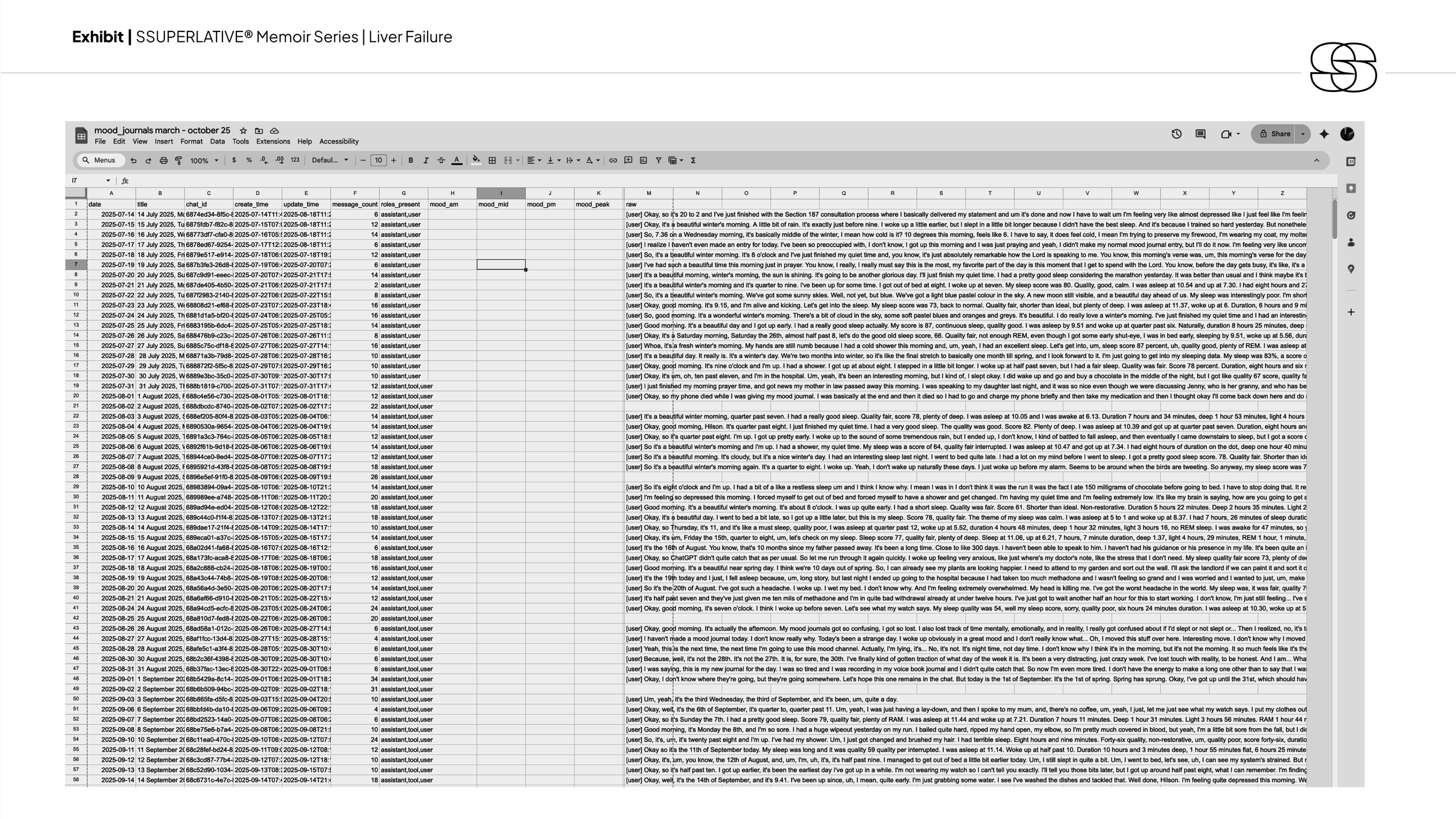 Before the dashboards and datasets, SSUPERLATIVE™ began in voice. The recordings were raw, spontaneous, and often caught between moments — fragments of mania, fatigue, reflection. These sessions revealed what written journals never could: the tremor of exhaustion, the rhythm of thought, the cadence of emotion. Each voice entry became data, a pulse of human experience rendered in tone and breath.