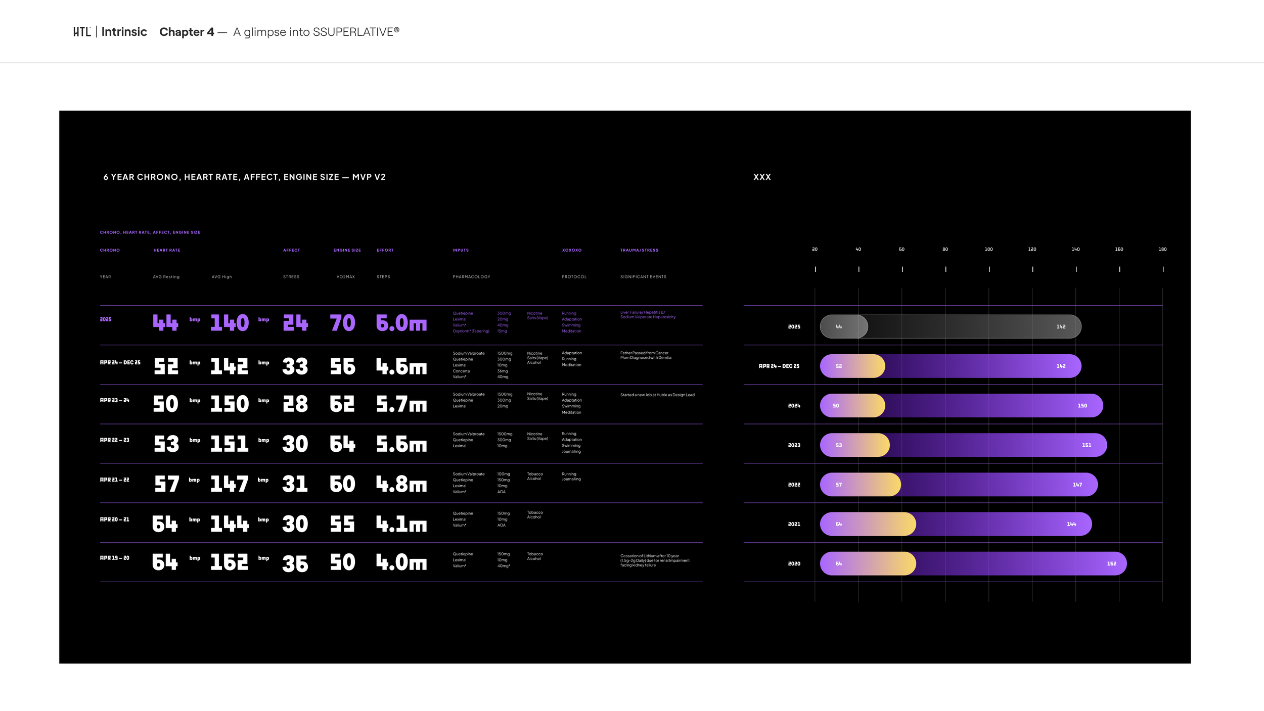 Over the course of a year, each layer of this system — running, adaptation, journaling, sleep, and pharmacological data — is measured with the same precision as a Strava log. Every dataset represents a different dimension of recovery and performance, from mood variability to biochemical balance.