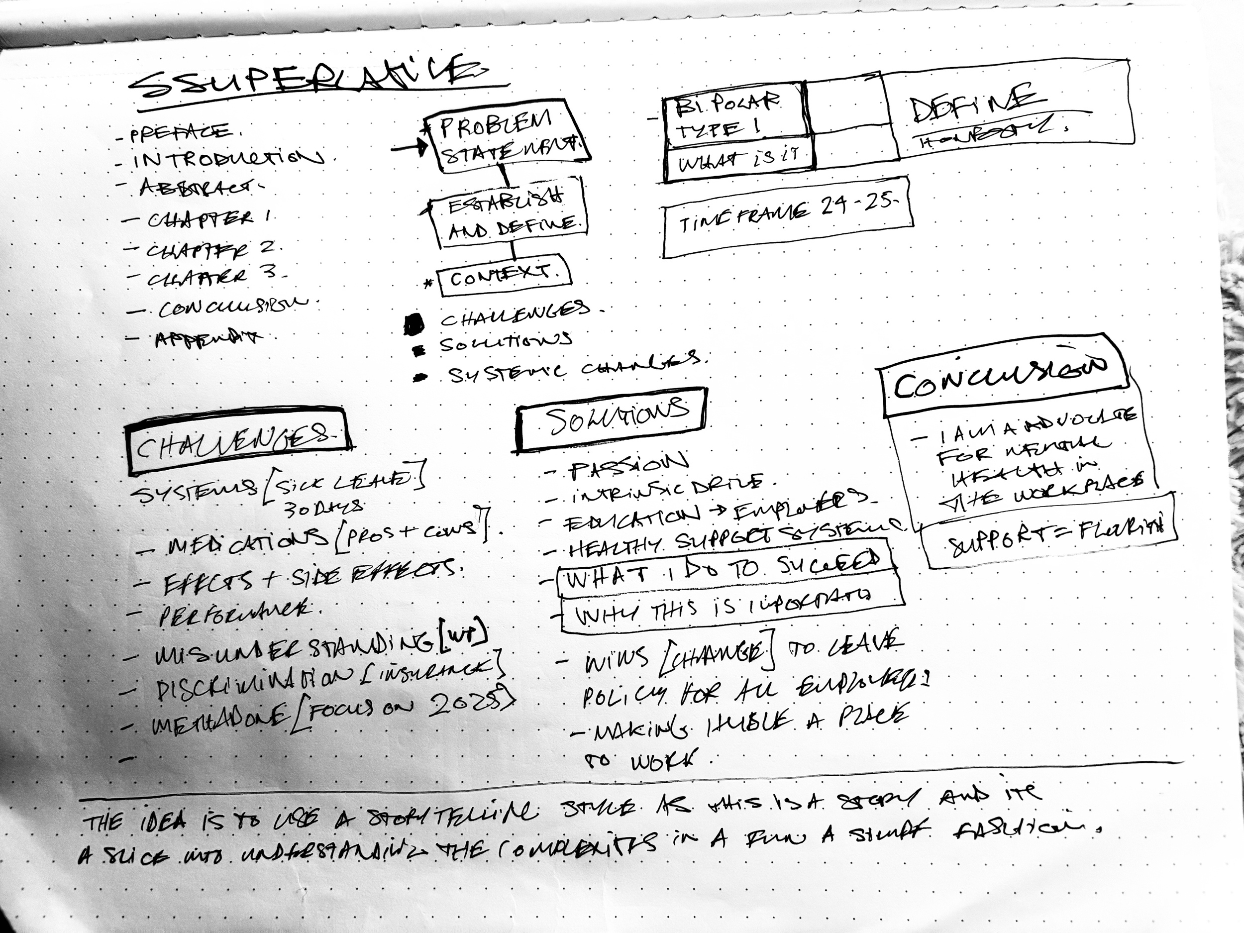 Voice journaling, data visualisation, and AI analysis have all become ways of designing visibility into an invisible disorder. SSUPERLATIVE™ stands as both creative practice and survival framework — evidence that design thinking, when turned inward, can reveal the architecture of being human.
