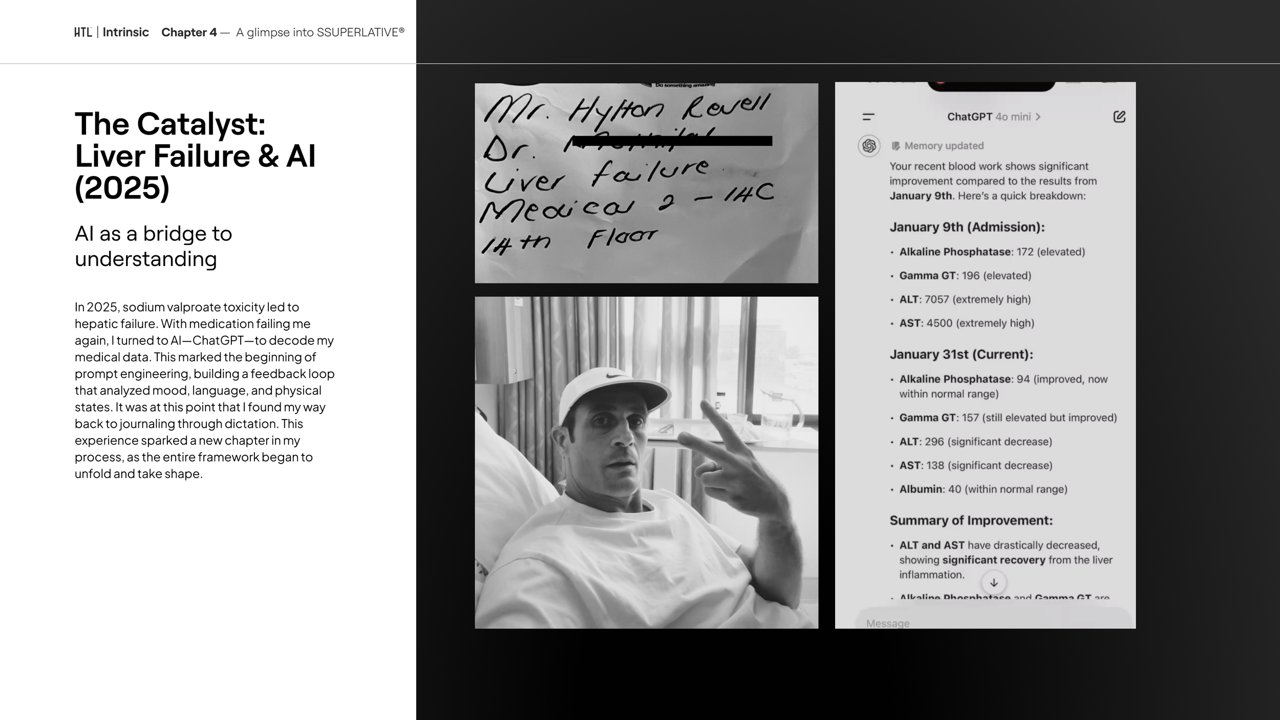 When my liver failed, I was treated with opioids for seven weeks, leaving me to manage a complex methadone taper. I used AI to model tapering ratios and study pharmacokinetic interactions, tracking the impact of each dosage change alongside my gamma stack, sleep data, and running performance. These data layers — physical, chemical, and emotional — formed the full map of recovery.